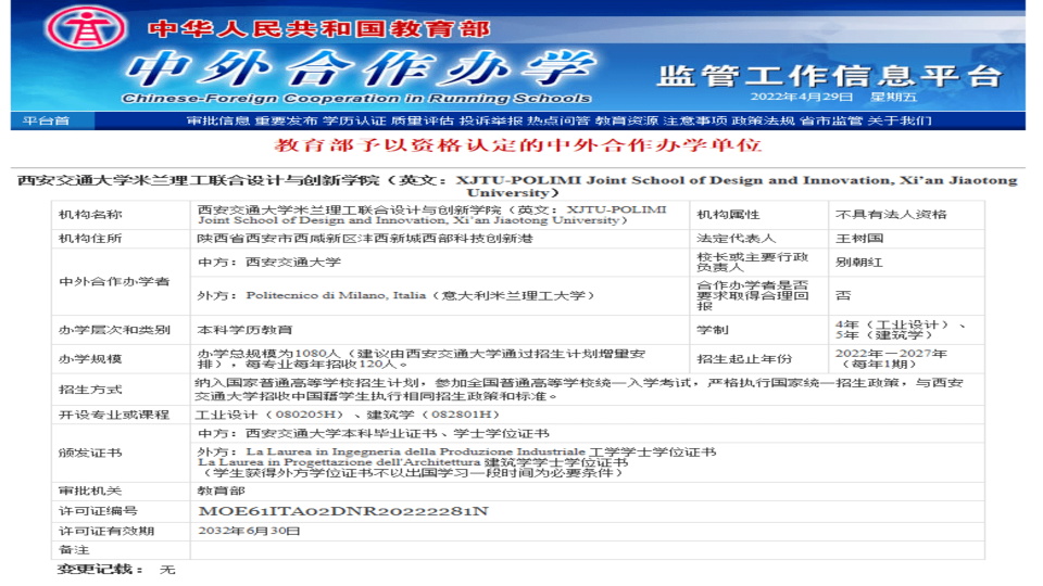 In data 18 aprile 2022 il Ministero dell'Istruzione Cinese (MOE) ha ufficialmente approvato la costituzione della XJTU-Polimi Joint School